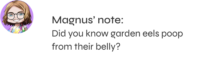 Garden eels live in colonies, peeking up from the sand together, making them look like glittering strands of grass on the ocean floor. They spend most of their life burrowed like this, and can escape tail first into their burrow to avoid danger. | ![]() |