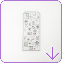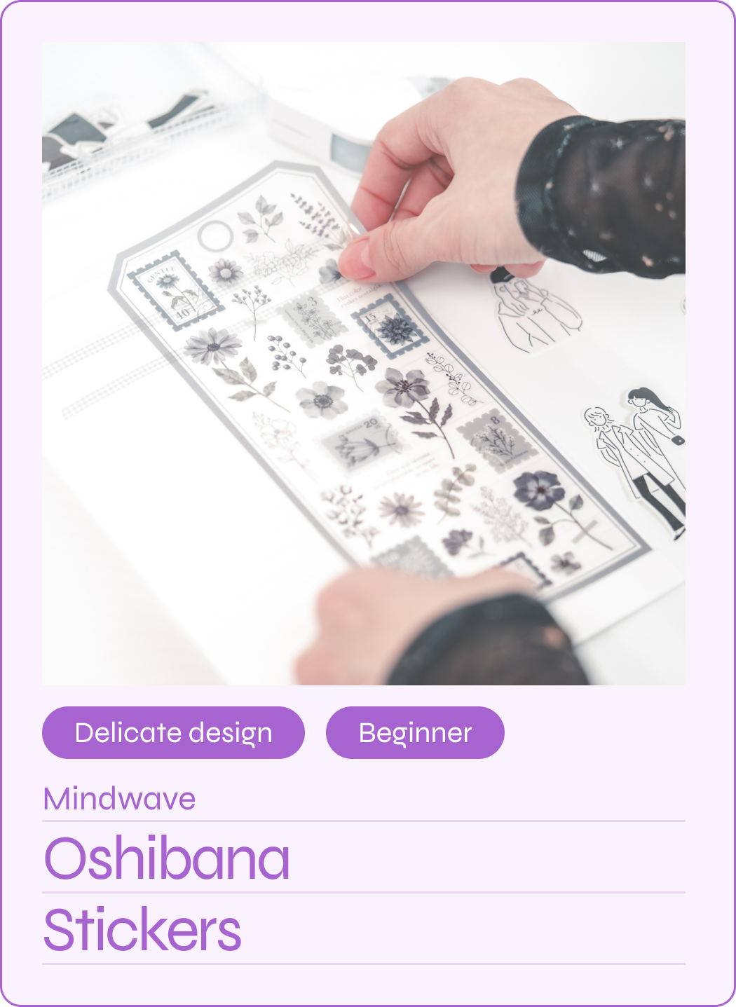 A sheet of very detailed die cut vinyl stickers on a transparent sheet. The name oshibana means “dried flowers” referencing how the flower design lay neatly on whatever surface you stick them to.