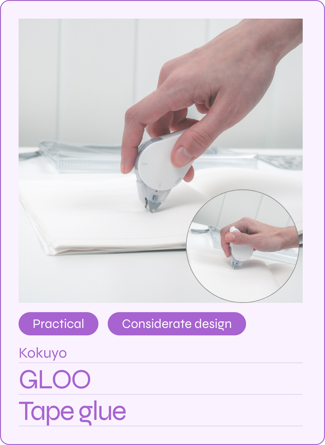 Equal part essential stationery, equal part ASMR machine, the GLOO is unsurprisingly for gluing things! This is a glue tape dispenser, using a hexagon pattern to optimize the glue surface.
