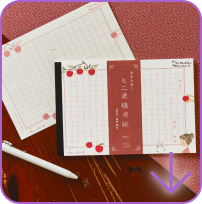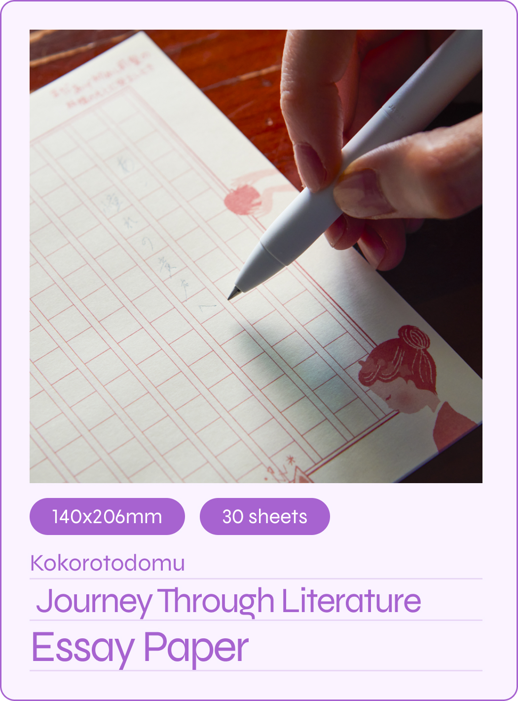This type of gridlined paper is the standard format for Japanese writers. This booklet is designed to inspire the poet in you with lines from the famous poem “Hatsukoi” written in the upper right corners.