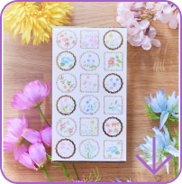 There are 18 stickers and each one features a flower like cosmos, cherry blossoms, morning glories and rhododendron from all 4 seasons. The shapes are either rounded squares or circles.  | ![]()  |