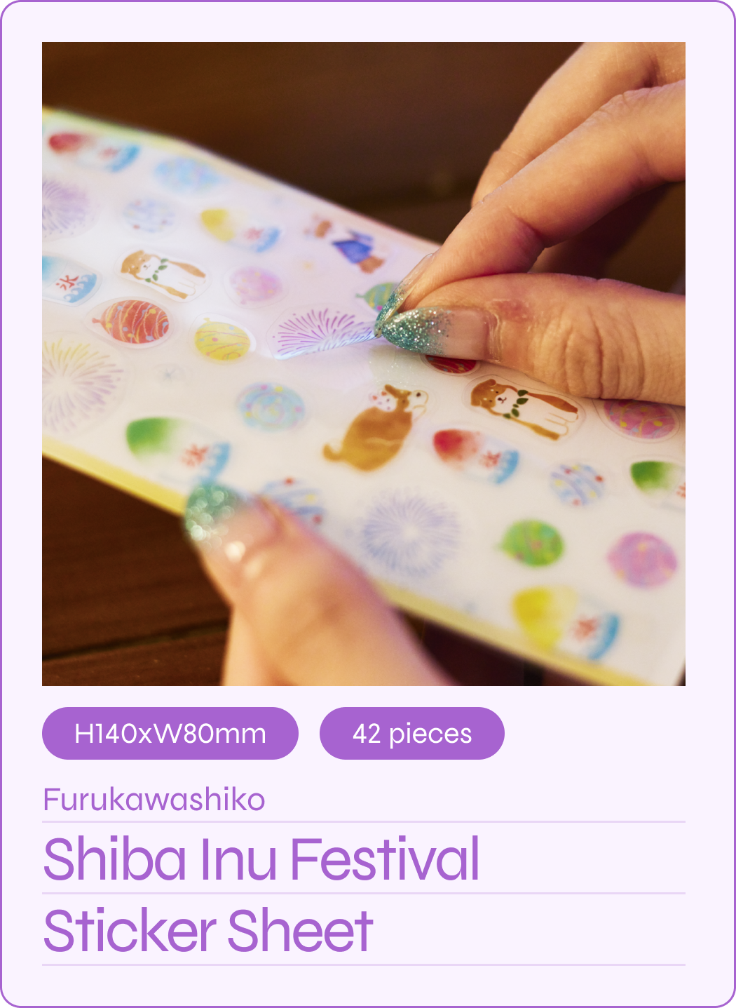 A summer festival themed sticker sheet with cute dogs playing the role of manning the stalls and visitors. Enjoy shaved ice, fireworks and water balloons to liven up your planner!