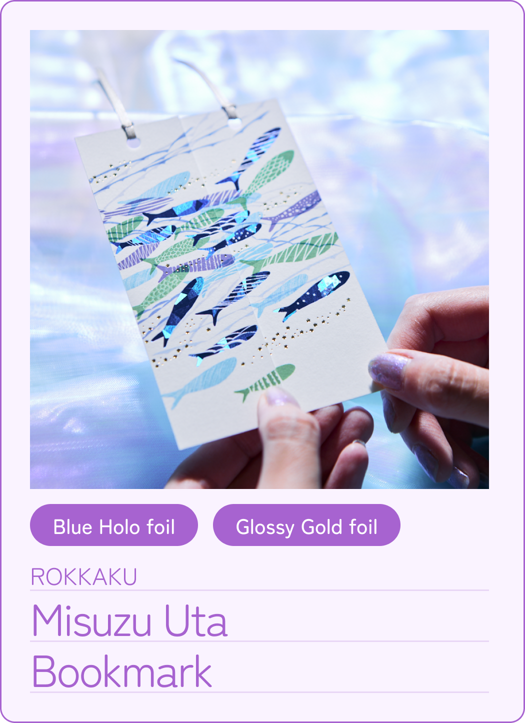 "Coloring beautiful poetry" is the name of a project that turns poems written by Misuzu Kaneko, a children's song poet from the Taisho period (1912-1926), into designs. Misuzu Uta was inspired by the poems of Misuzu Kaneko’s poems and thanks to the foil stamping brand ROKKAKU this series became a reality!