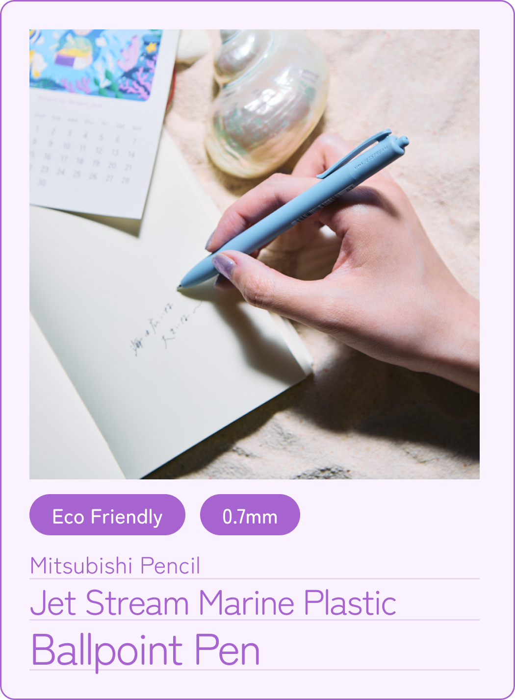 The barrel of the product is made of 100% recycled resin from marine plastic waste, made up of almost 100% post-consumer materials. It’s a ballpoint pen certified as a product specialized in combating marine plastic waste.