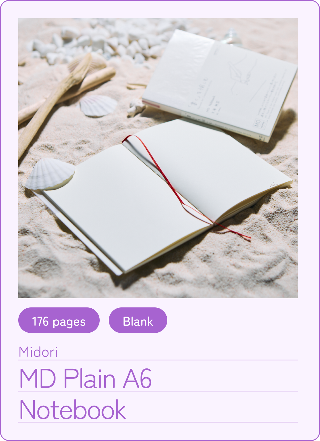 “Designed for comfortable writing” is the slogan for the Midori MD notebook. It is noticeable in every detail, like how the paper’s gentle tooth makes a light noise when written on, or the ability to open the book 180 degrees flat on any page.