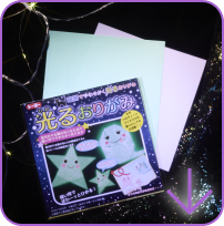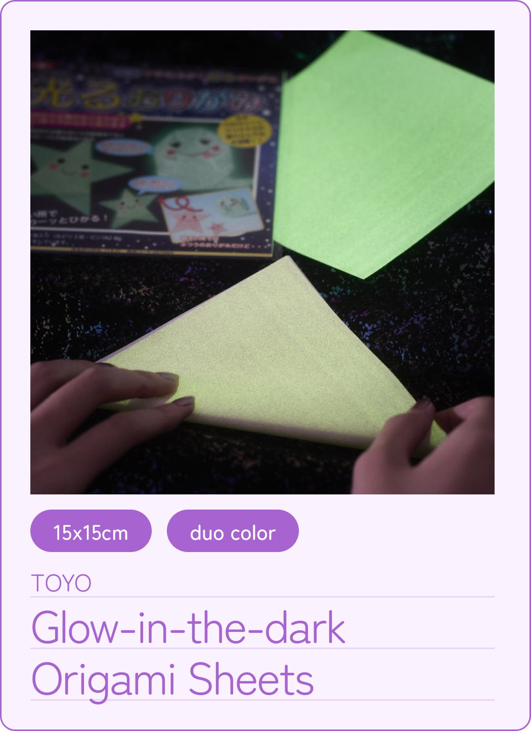 A special origami paper that glows in the dark. The effect is activated by being exposed to sunlight or fluorescent light, and lasts about 15 minutes after the light is gone. Use this to fold mystical creations or slice it as design paper.