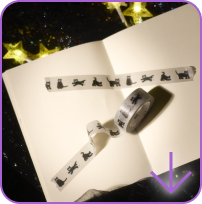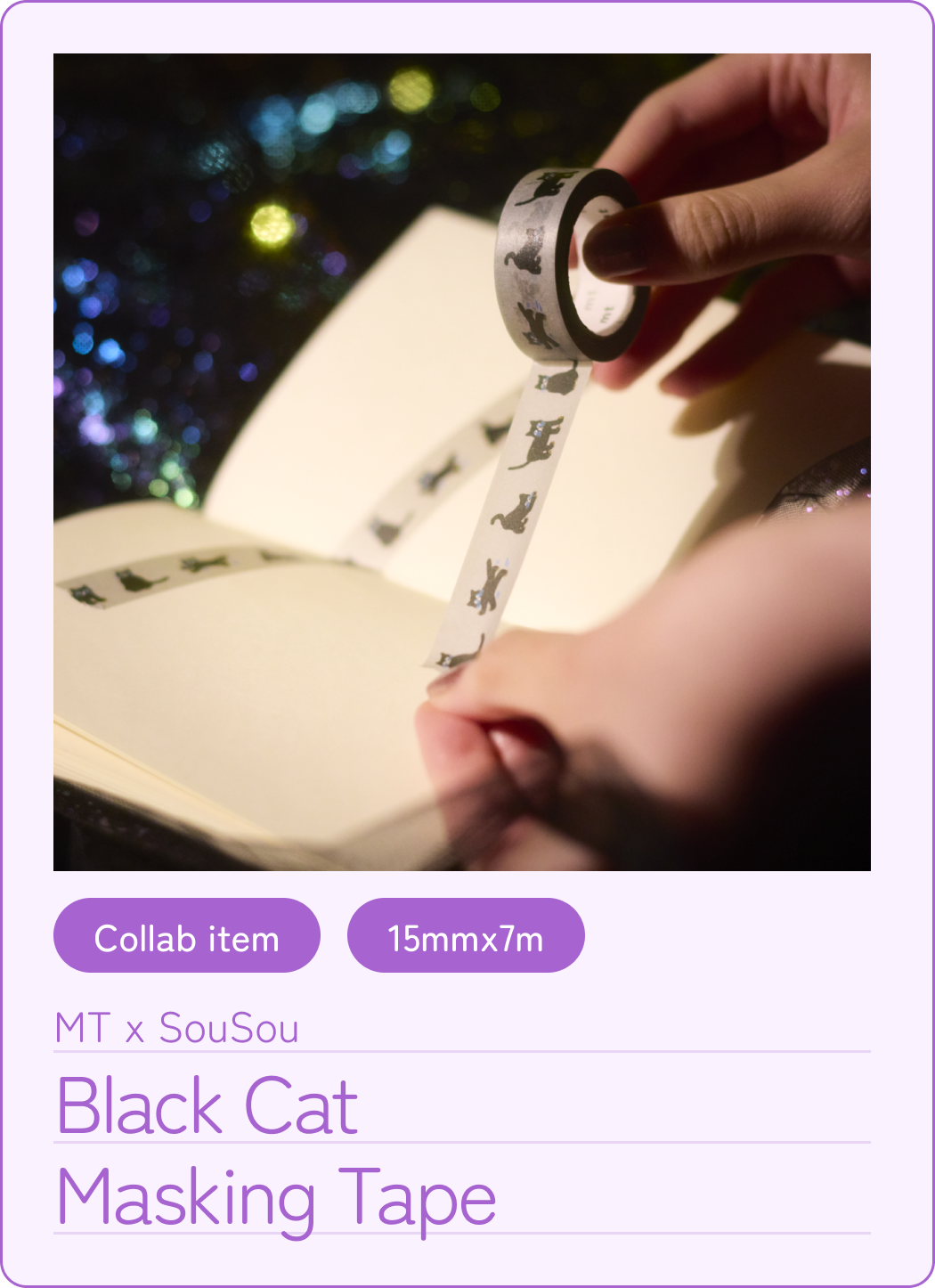 A playful washi tape with a black cat design, a signature of SOUSOU. The design house has many versions of this cat design and we decided on the black cat version for this box as it fits the night time vibe.