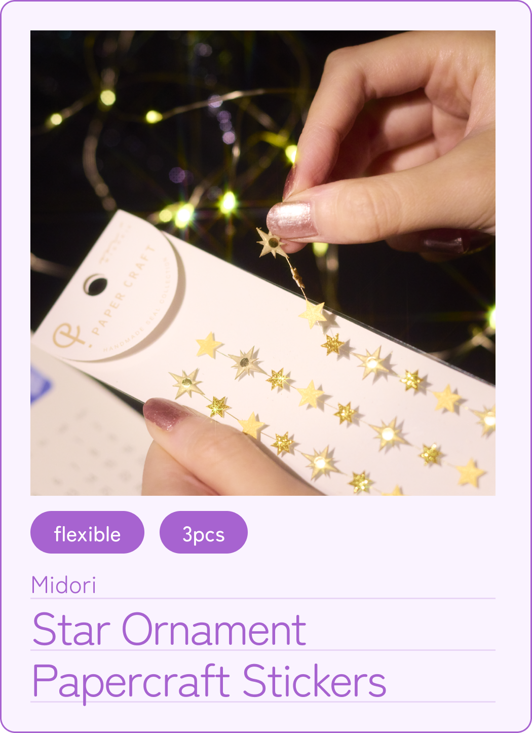 Midori once again displays innovation with a unique sticker set. These star ornament stickers are linked together with an elegant string. Make a circle, waves, have them partly stuck or even cut the string for extra freedom!