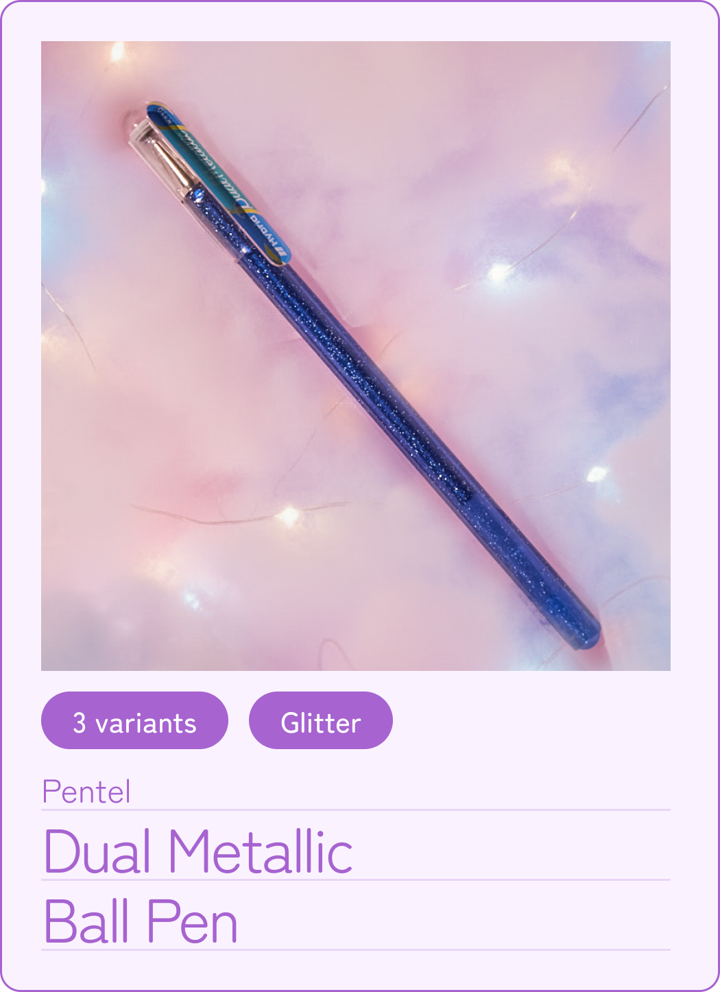 It’s the same series as the brush version, and works well with other pentel series like the mattehop or milkey series.You’ll either receive Light Violet with red glitter or Deep Blue with green metallic. | ![]() |