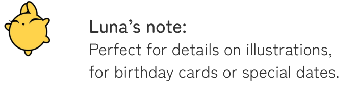 A wonderful glitter pen with different color ink and glitter that creates a unique look to any illustration. Based on the light and angle you look at it, the expression changes. The ink is smooth, and looks clear on both light and dark paper.